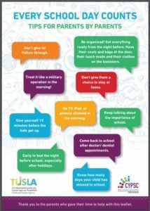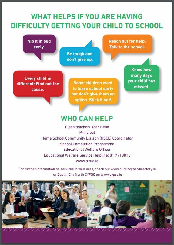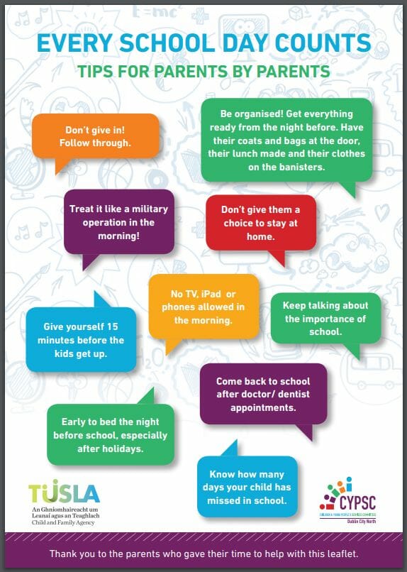More information on: https://www.tusla.ie/services/educational-welfare-services/information-for-parents-and-guardians/school-attendance-what-every-parent-needs-to-know/