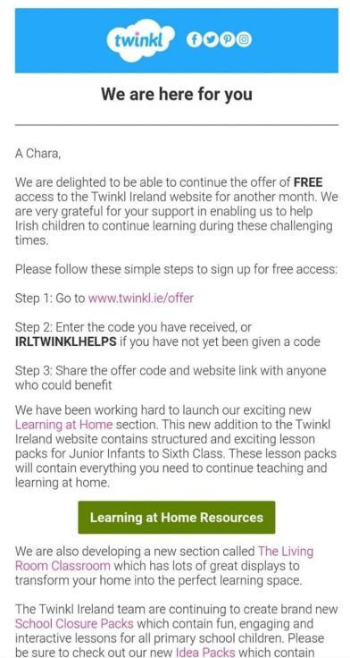 Dear Parents, please find the attached e-mail addresses of all the teachers. As the school does not have e-mails for all parents you are asked to initially send an e-mail to the teacher of your child by Wednesday the 20th. Please note 6th class may contact Mrs Ahern. Children in need of support may contact Miss Mulvihill, Mrs Leahy (Miss Kearney), Mrs Flaherty (Miss O’Shaughnessy) and Mrs Horgan.  We will contact you in the near future in relation to classes, book lists etc. Please note children will work from the current books when they return in September with a view to revision.
