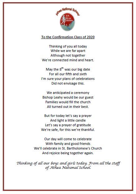 Sadly, we have had to postpone the celebration of the First Holy Communion for the moment. We will celebrate together as soon as possible and we are looking forward to gathering together for the very special occasion. Miss Nolan prepared a lovely poster for all the Communion children, just to let them know that we are all thinking of them.